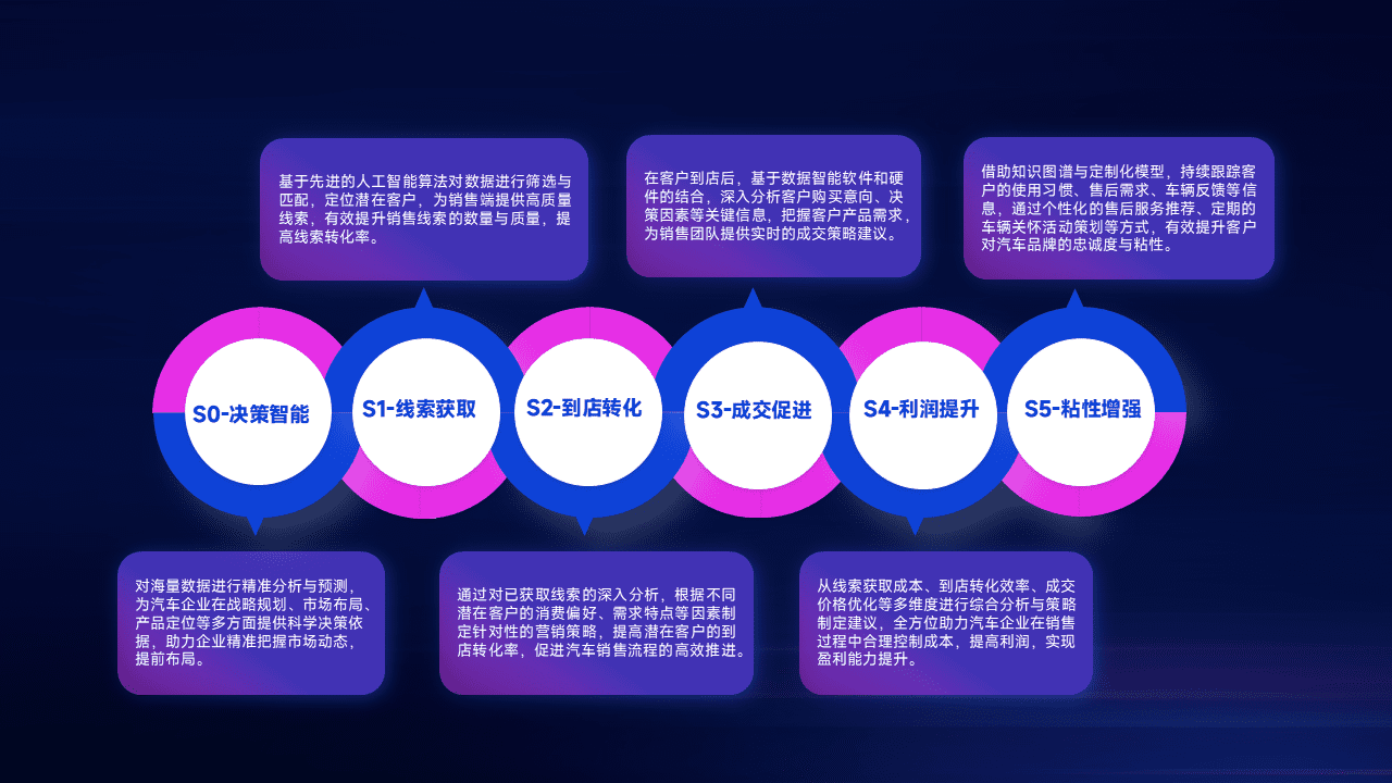 基于销售转化漏斗的薄弱环节,,为客户提供数据+模型+运营的智能应用,,,实现销售业绩的提升;推动线索管理全链路的精细化管理和运营。。